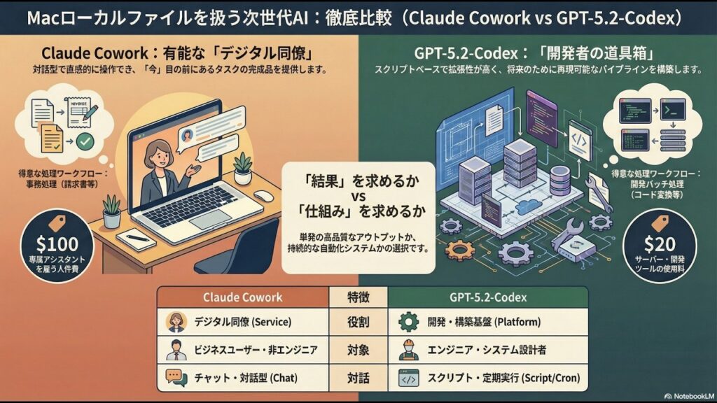 【徹底比較】Macのローカルファイルを操作するAI、どっち選ぶ?Claude Cowork vs GPT-5.2 Codex「同僚」vs「仕組み」