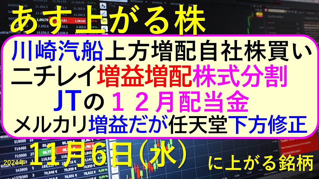 今日の引け後に出た材料で、明日11/6(水)に期待できる銘柄。川崎汽船が上方修正・増配・自社株買い、メルカリは増益だが未達。任天堂は下方修正。ニチレイが増益・増配・株式分割。JTの12月配当金。~あす上がる株。最新の日本株情報。高配当株の株価やデイトレ情報についてもお話しいたします。