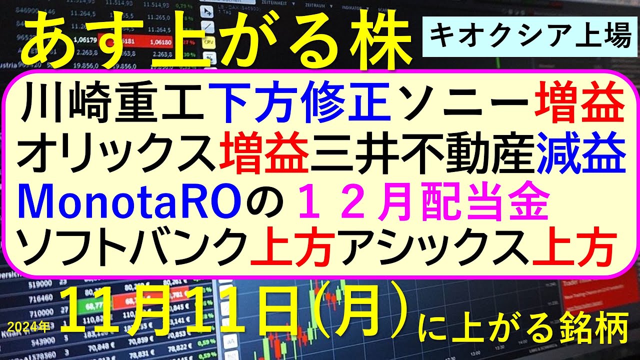 今日の引け後に出た材料で、週明け11/11(月)に期待できる銘柄。川崎重工、ソニー、オリックス、三井不動産、ソフトバンク、アシックスの決算。MonotaROの12月配当金。キオクシアが12月に上場~あす上がる株。最新の日本株情報。高配当株の株価やデイトレ情報についてもお話しいたします。
