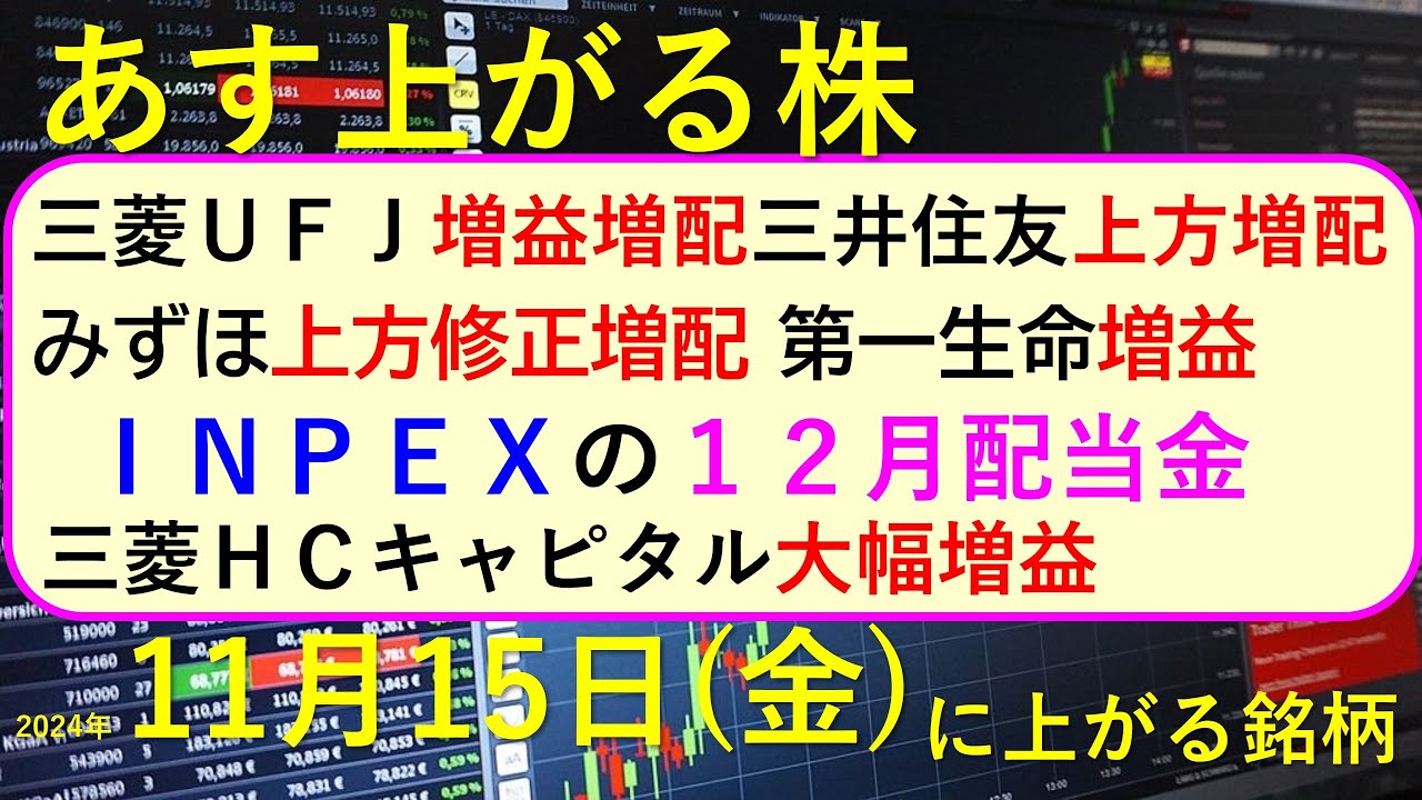 今日の引け後に出た材料で、明日11/15(金)に期待できる銘柄。三菱UFJ、三菱HCキャピタル、三井住友、みずほ、第一生命の決算。INPEXの12月配当金~あす上がる株。最新の日本株情報。高配当株の株価やデイトレ情報についてもお話しいたします。