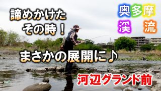 奥多摩渓流釣り。前日に成魚放流がされている河辺グランド前に入渓。ヤマメを狙って瀬を探ったが、水量が少なく大苦戦。諦めかけたその時、怒涛の入れ食いが!2025/4/28