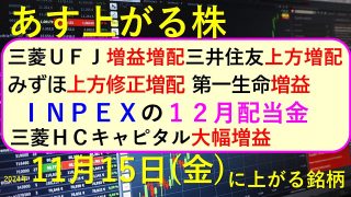 あす上がる株 2024年11月15日(金)に上がる銘柄。三菱UFJ、三菱HCキャピタル、三井住友、みずほ、第一生命の決算。INPEXの12月配当金~最新の日本株情報。高配当株の株価やデイトレ情報~